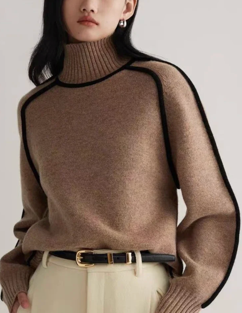 Ce pull élégant allie luxe minimaliste et détails modernes. Confectionné dans un mélange de laine douce, il offre un confort et une chaleur incomparables. Le passepoil contrastant discret aux épaules et aux manches apporte une touche raffinée et contemporaine à sa coupe classique. Parfait avec un pantalon ou un jean pour un look chic et décontracté.